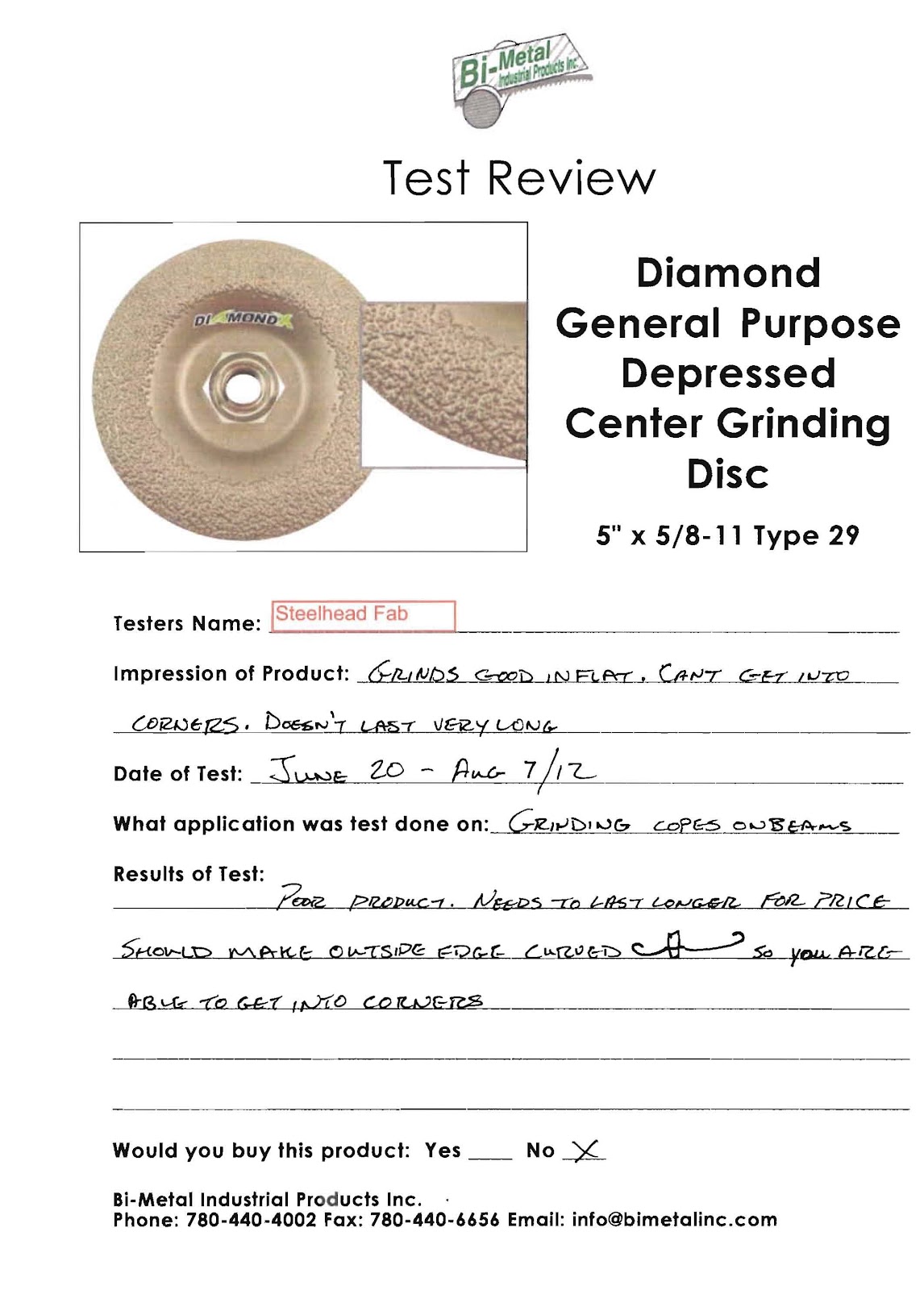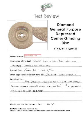 First just an update on some of trial products. This was one of our diamond discs we had sent out. It was our diamond general purpose depressed center grinding disc 5” x 5/8-11type 29 disc (see review below). We sent it to a welding fabrication shop which does a lot oilfield and industrial welding work. Here is the tester’s feedback.